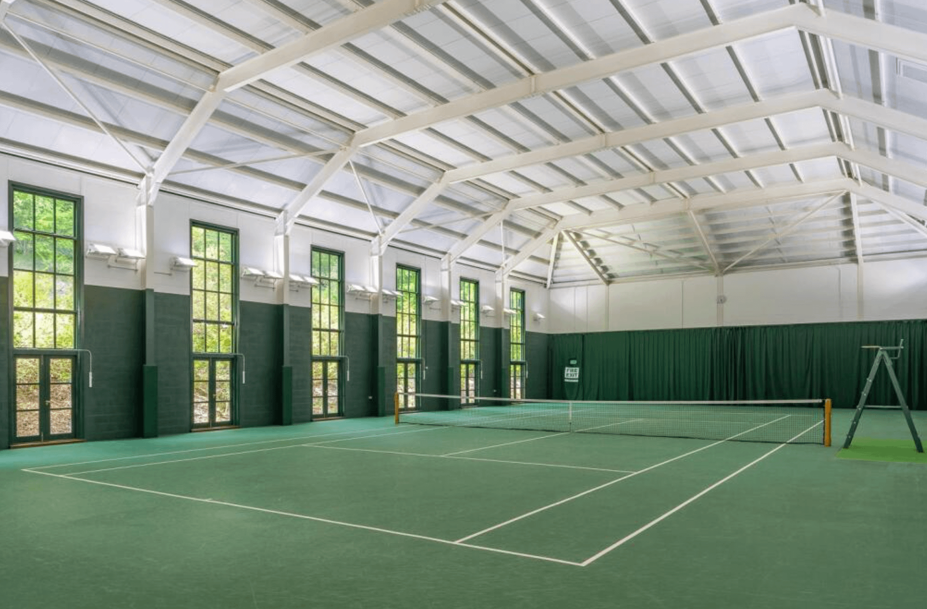 The estate features a grand mansion and 17 cottages & farmhouses. The mansion features 48,000 square feet of living space with 11 bedrooms, 11 bathrooms, multiple living & dining rooms, multiple kitchens, indoor racquetball court, indoor tennis court, indoor pool and more.
