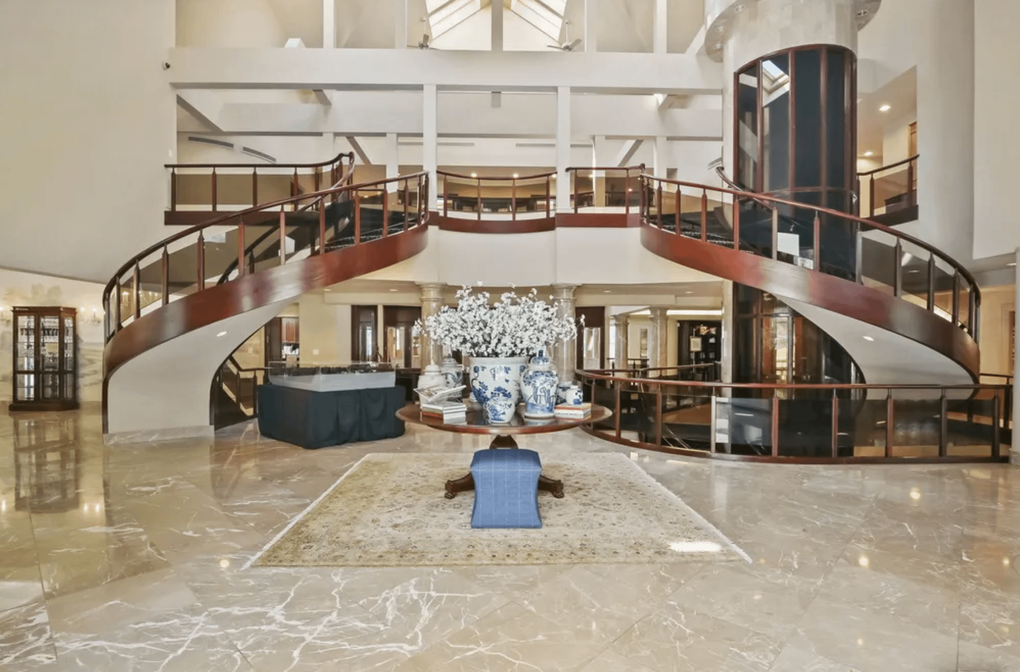 It features approximately 51,830 square feet of living space with 21 bedrooms, 26 full & 14 half bathrooms, 2-story foyer with grand double staircase, glass-enclosed elevator, multiple living & dining rooms, 7 kitchens, library, conference room, movie theater, disco/nightclub/casino, recording studio, gym, indoor racquetball court, indoor swimming pool, 8-car garage and more.
