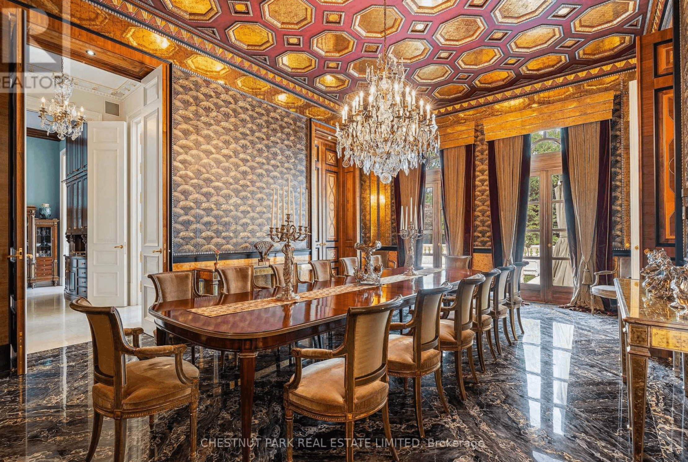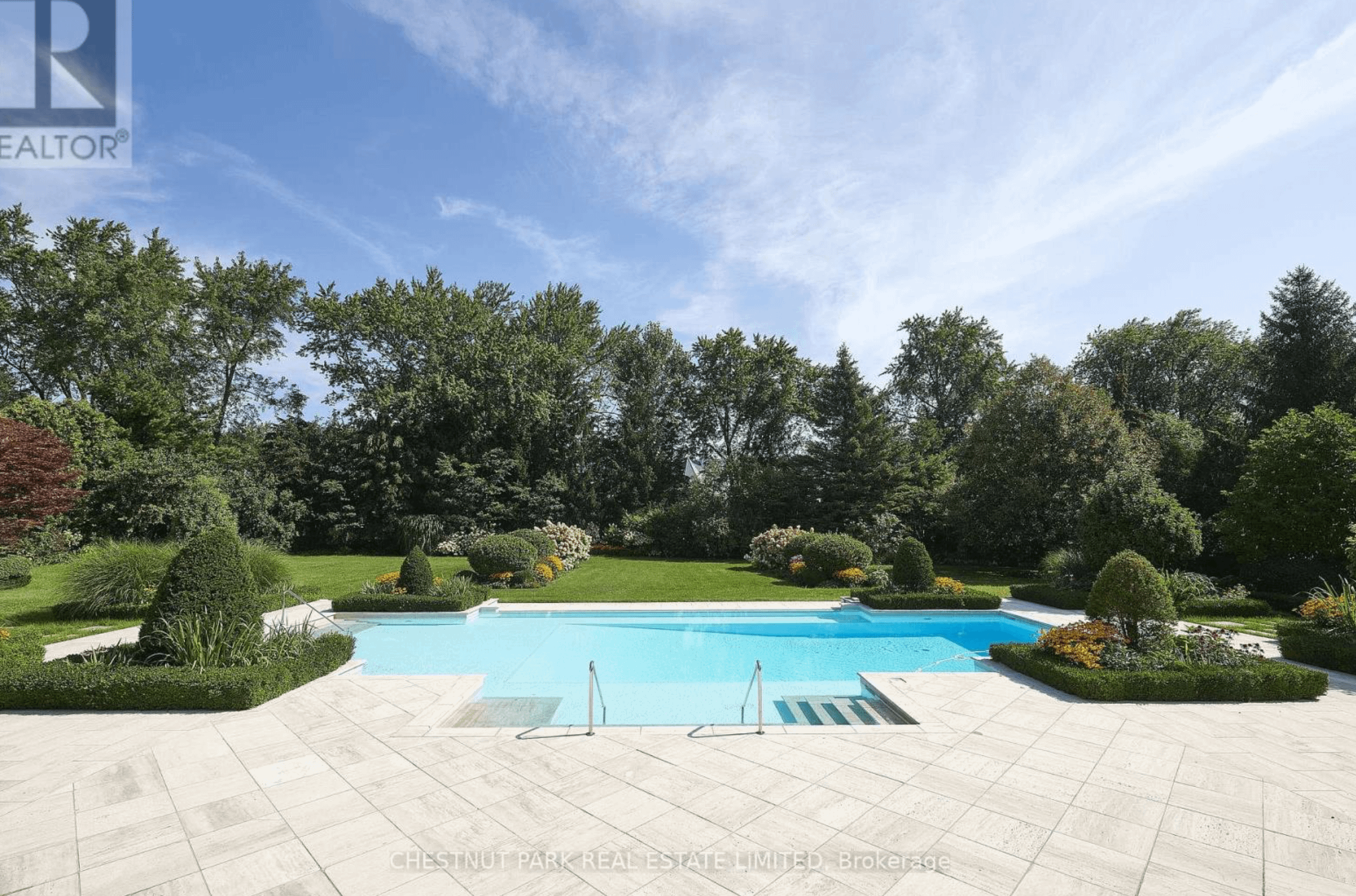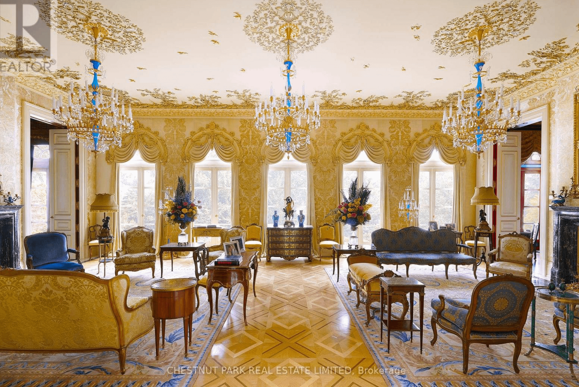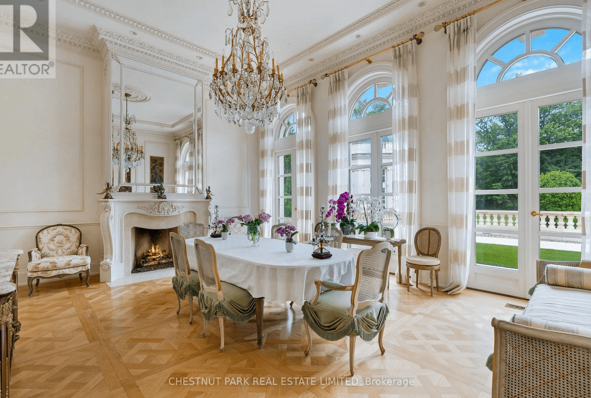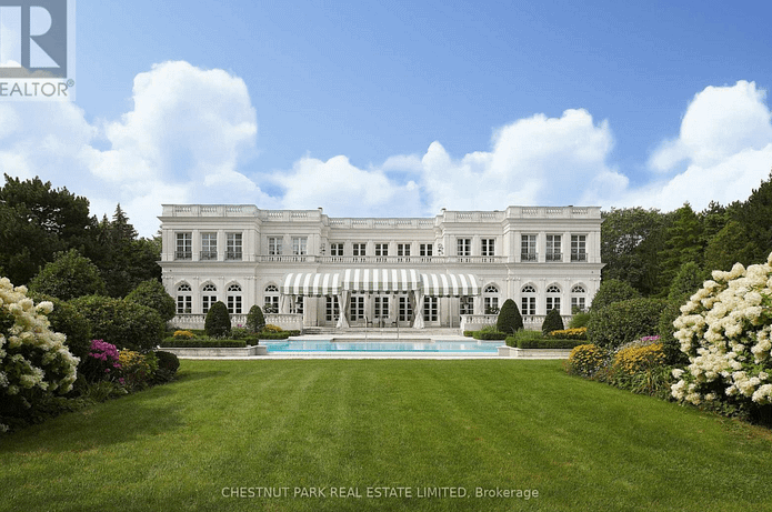 This grand French Revival style limestone home is located at 15 High Point Road in the exclusive Bridle Path neighborhood in Toronto, Ontario, Canada and is situated on 2 acres of land.
