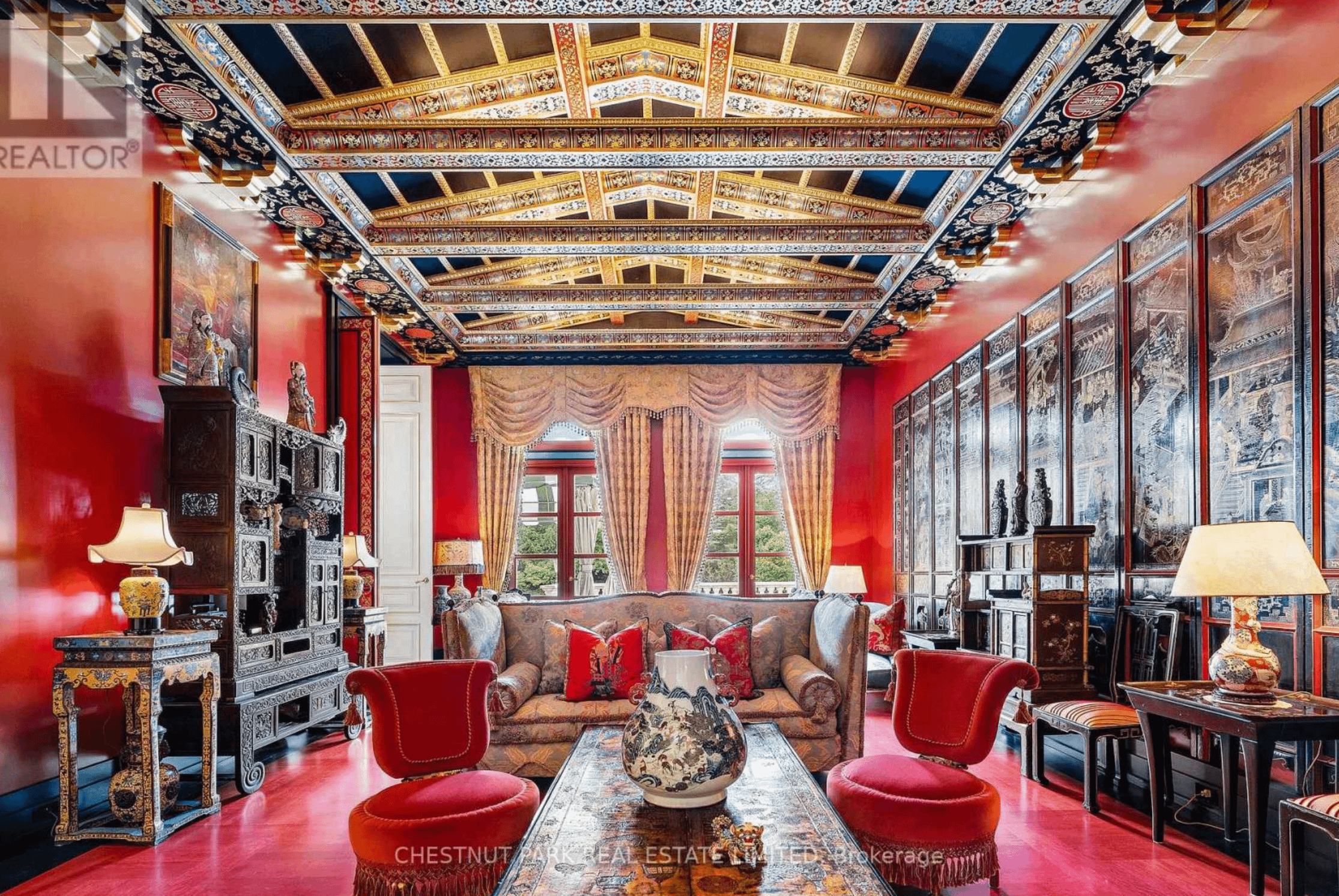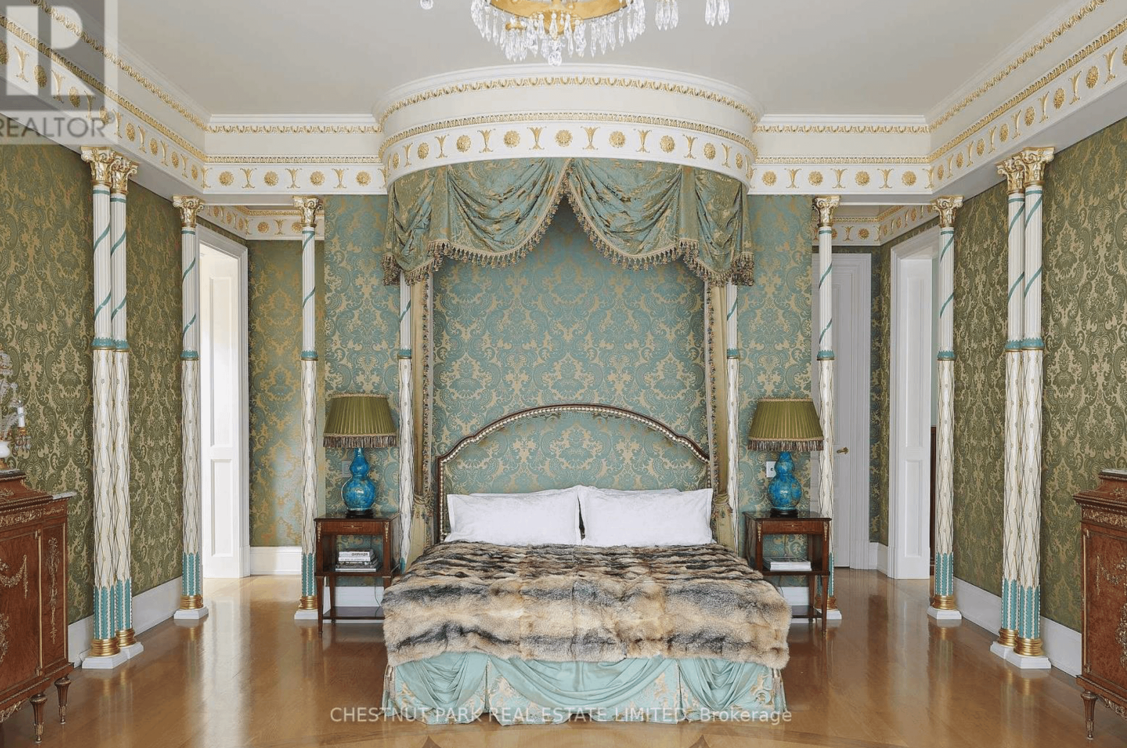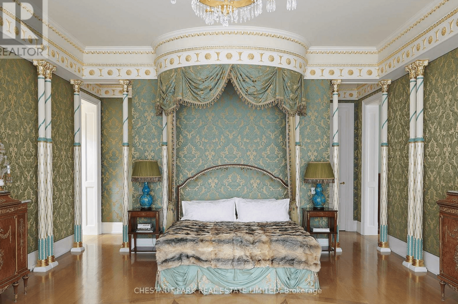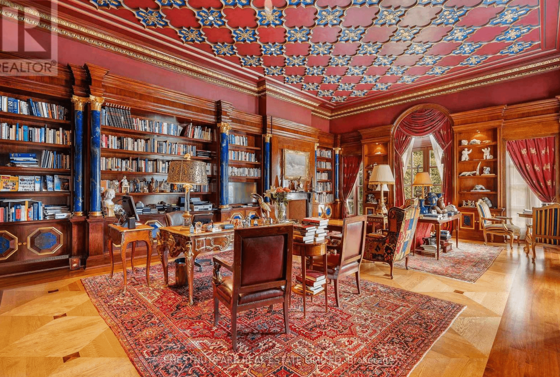 This grand French Revival style limestone home is located at 15 High Point Road in the exclusive Bridle Path neighborhood in Toronto, Ontario, Canada and is situated on 2 acres of land.