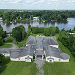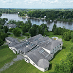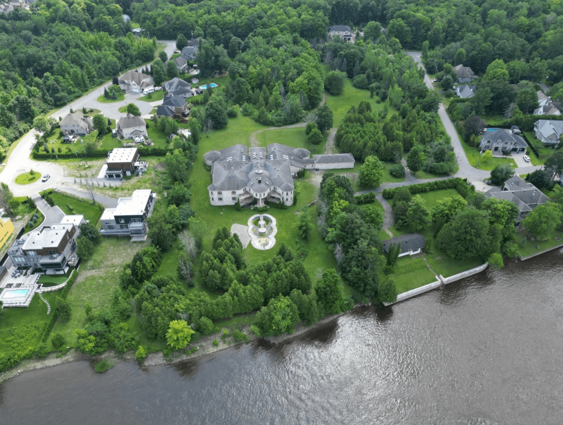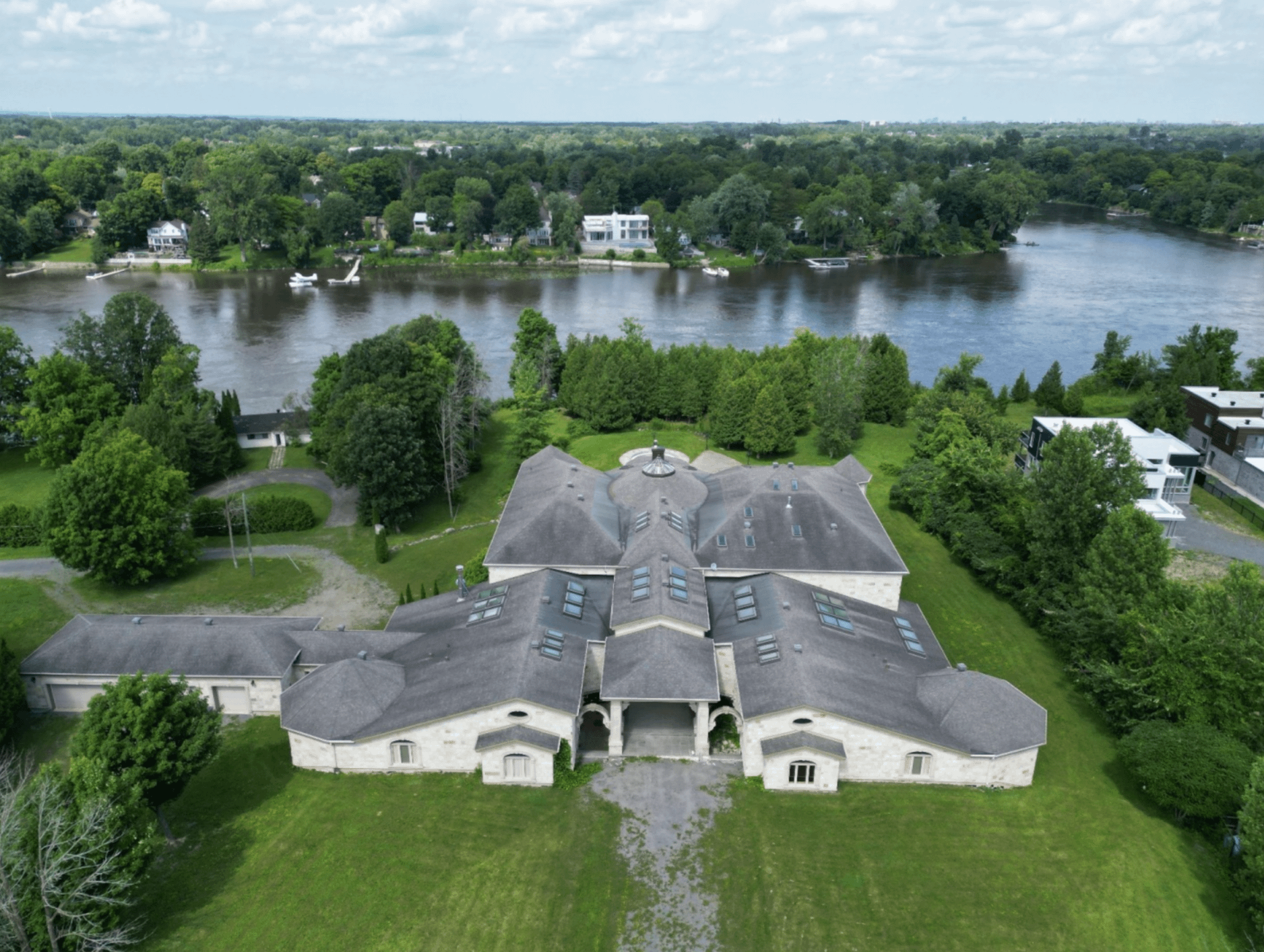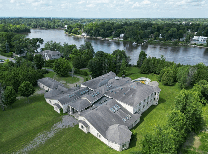 This unique riverfront home is located at 2695 Ch. Dutour in Montrรฉal, Quebec, Canada and is situated on over 6 acres of land. It has been on and off the market for well over a decade now!