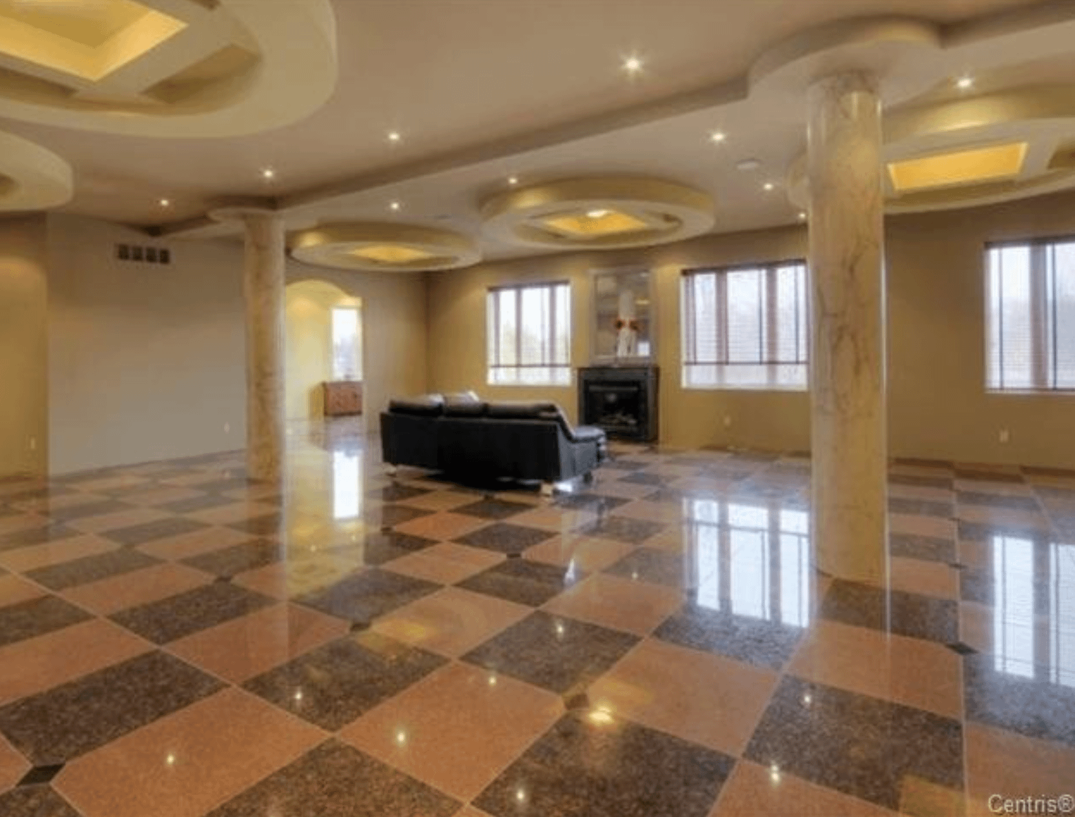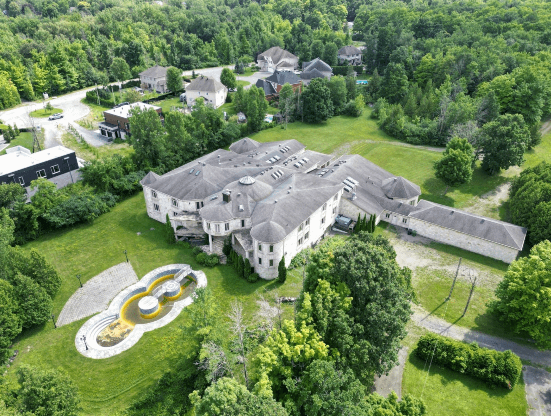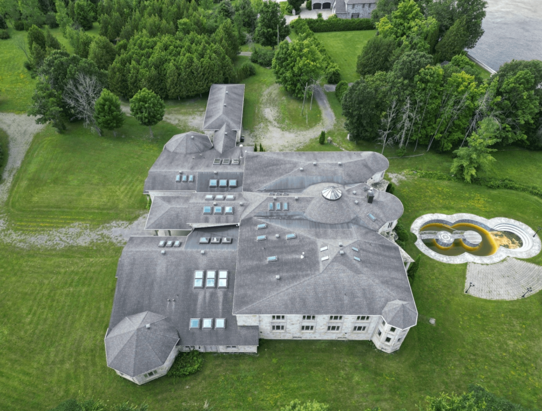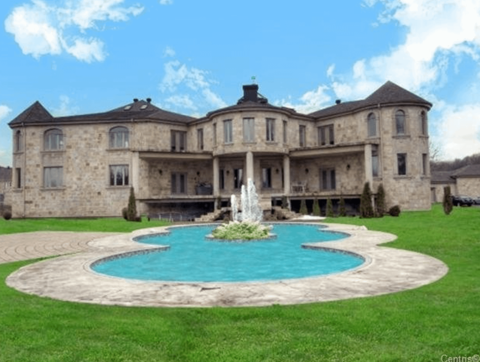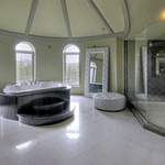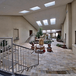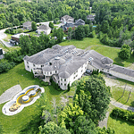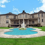 The 40+ room monstrosity was built in 2001 and features over 30,000 square feet of living space with 10 bedrooms, 8 bathrooms, two attached guest apartments, granite floors & staircases, 49 skylights, multiple living & dining rooms, movie theater, atrium with indoor pool, 9-car garage and more.
