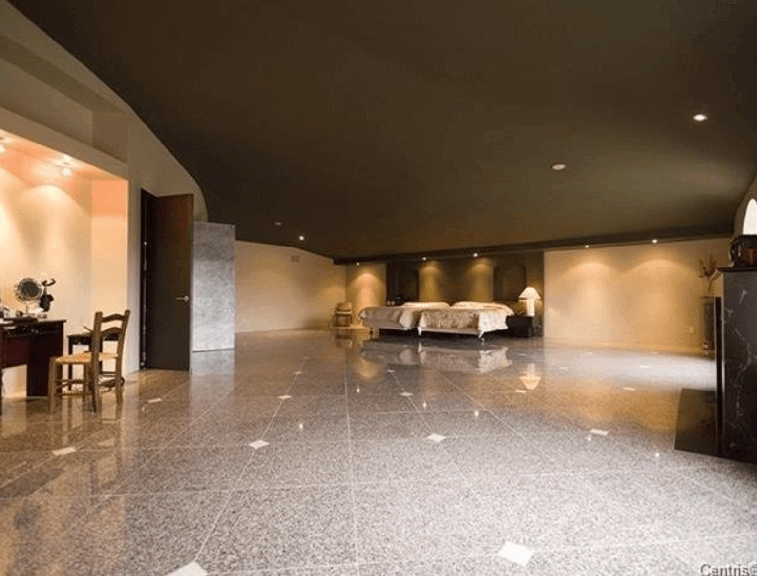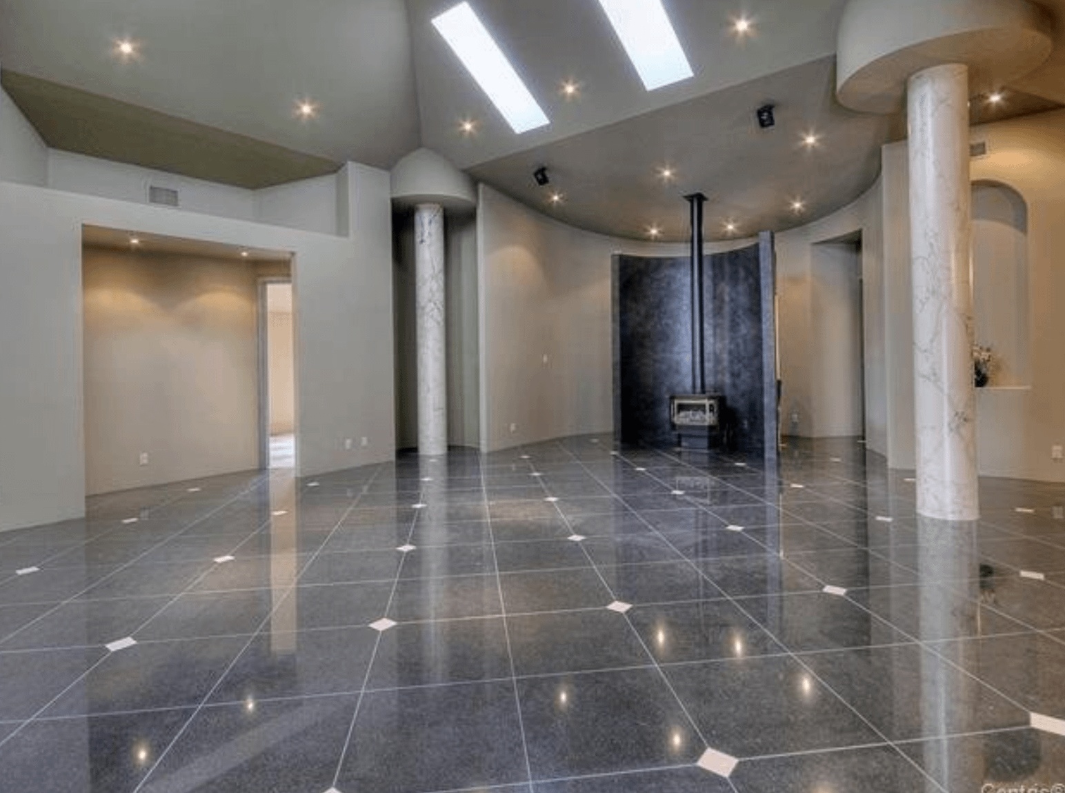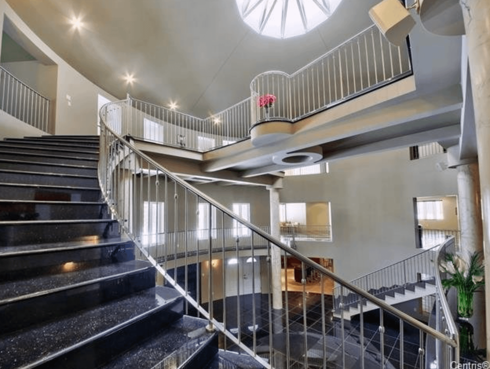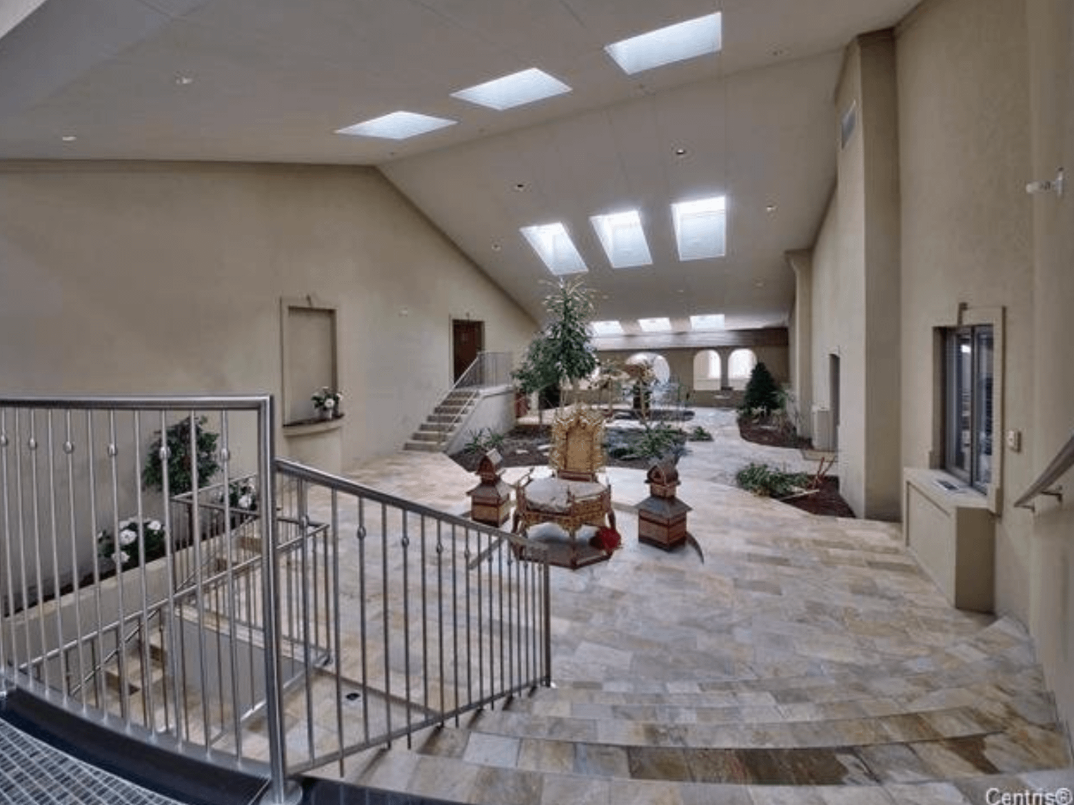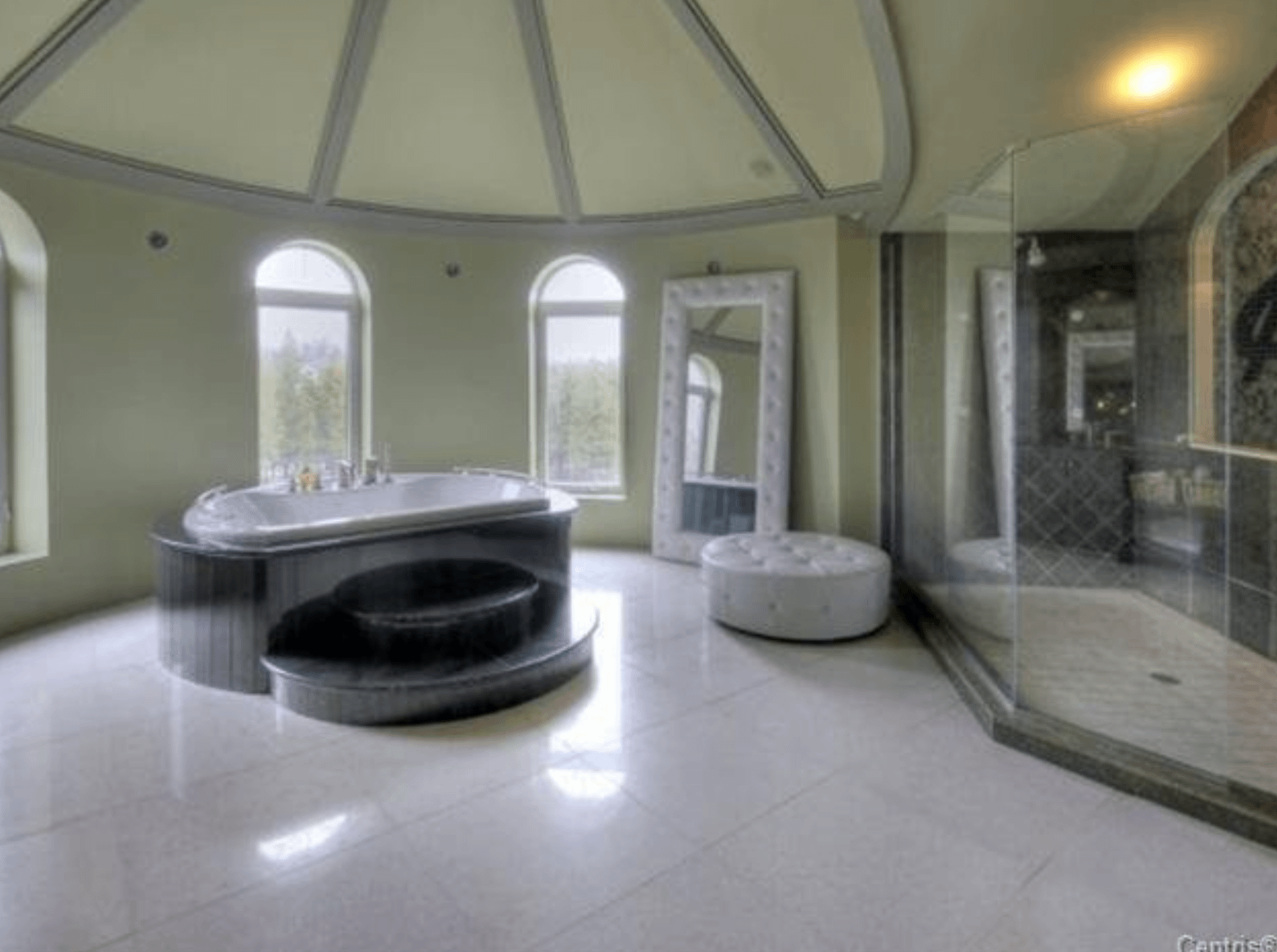 The 40+ room monstrosity was built in 2001 and features over 30,000 square feet of living space with 10 bedrooms, 8 bathrooms, two attached guest apartments, granite floors & staircases, 49 skylights, multiple living & dining rooms, movie theater, atrium with indoor pool, 9-car garage and more.