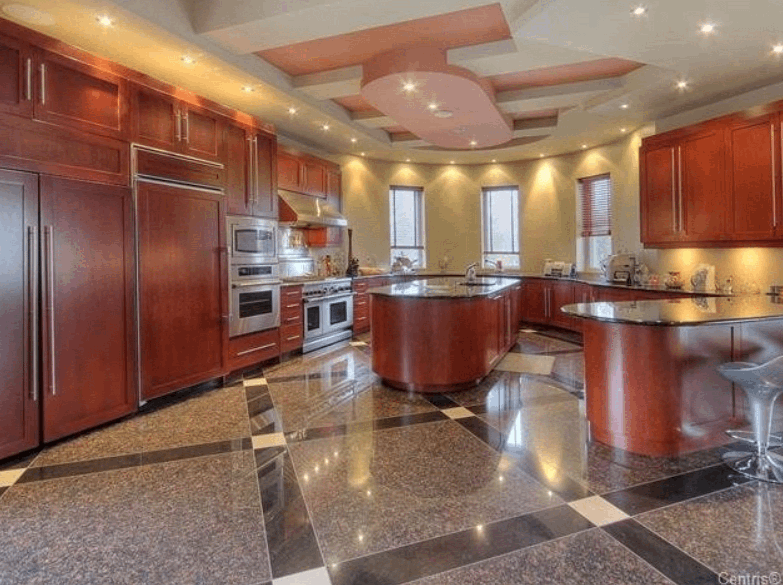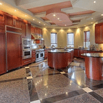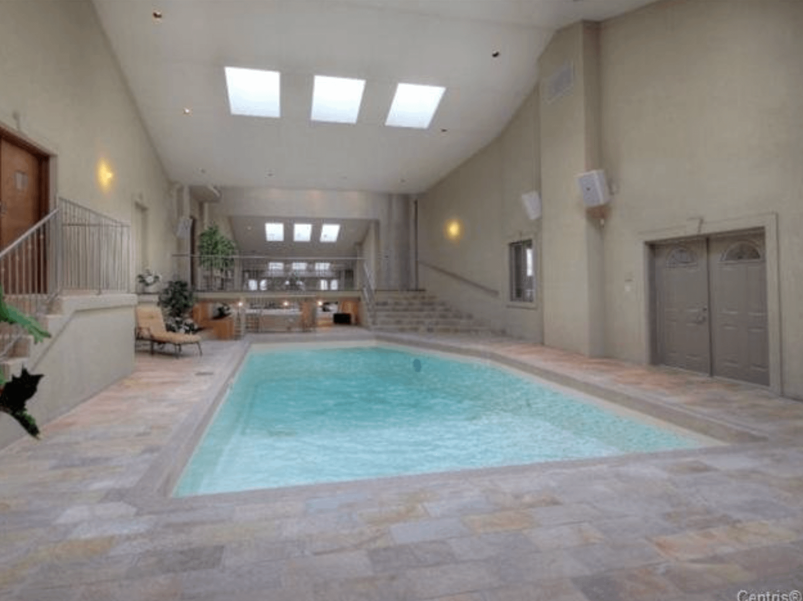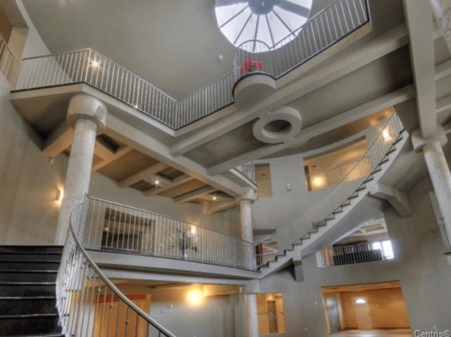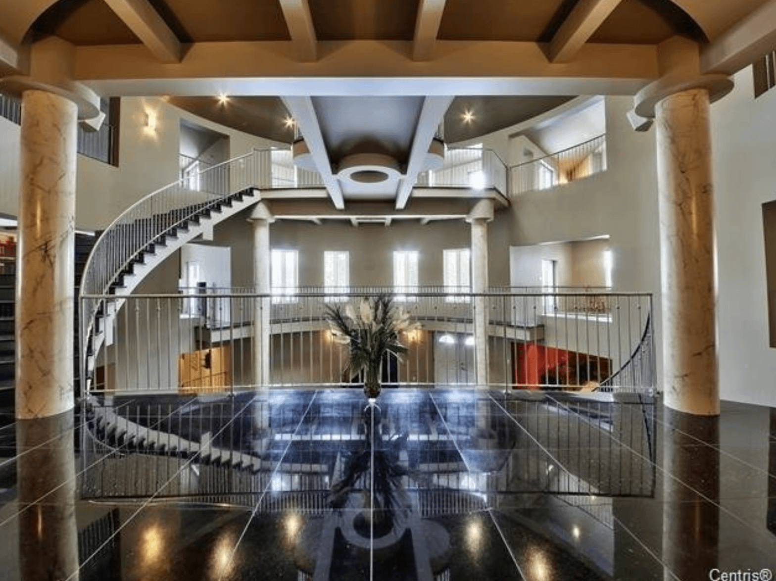 The 40+ room monstrosity was built in 2001 and features over 30,000 square feet of living space with 10 bedrooms, 8 bathrooms, two attached guest apartments, granite floors & staircases, 49 skylights, multiple living & dining rooms, movie theater, atrium with indoor pool, 9-car garage and more.
