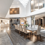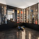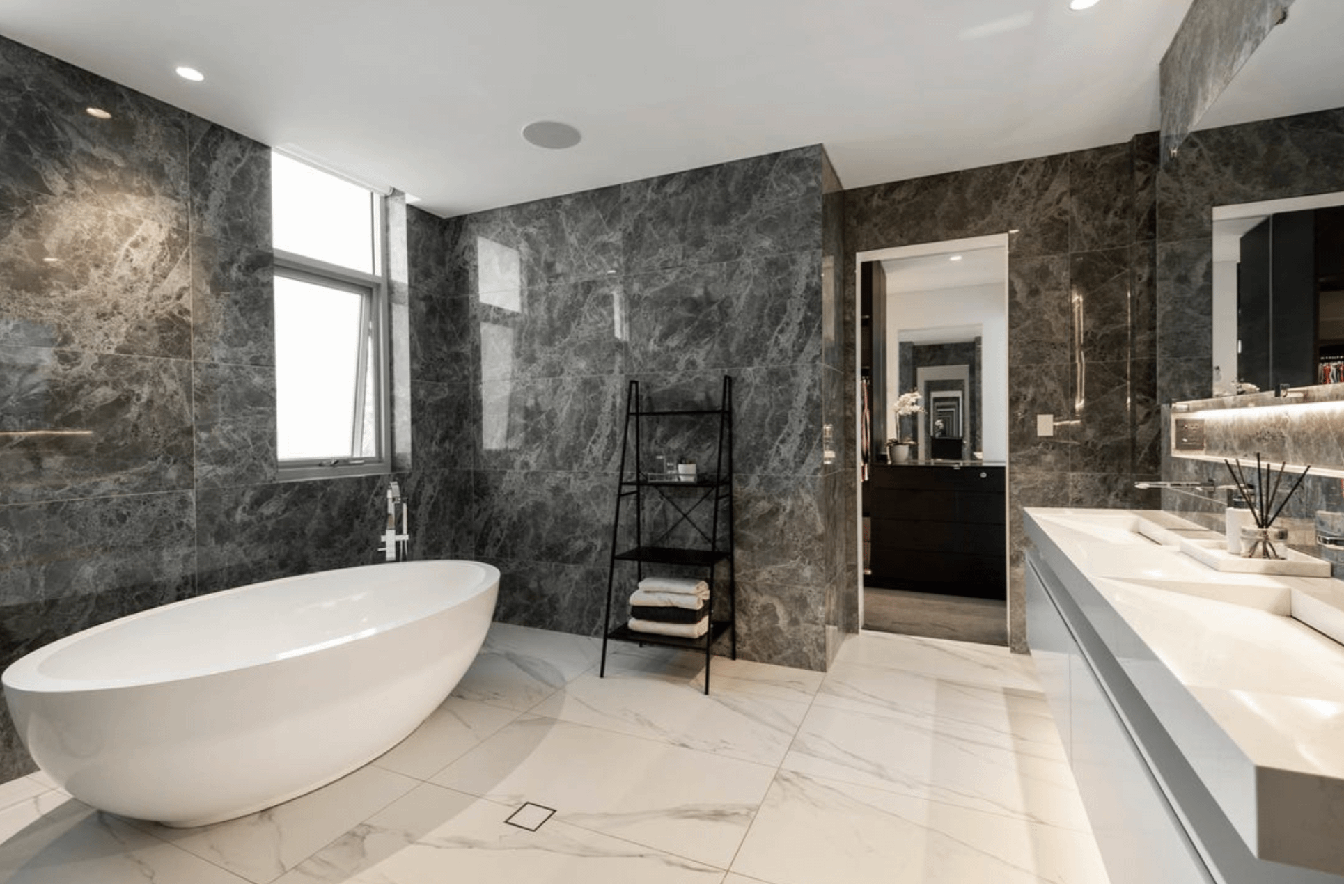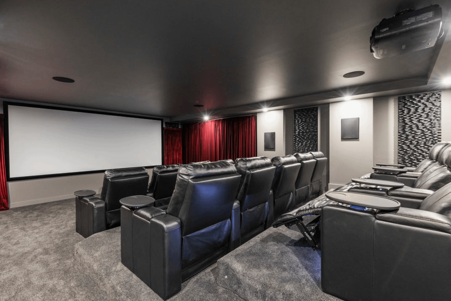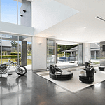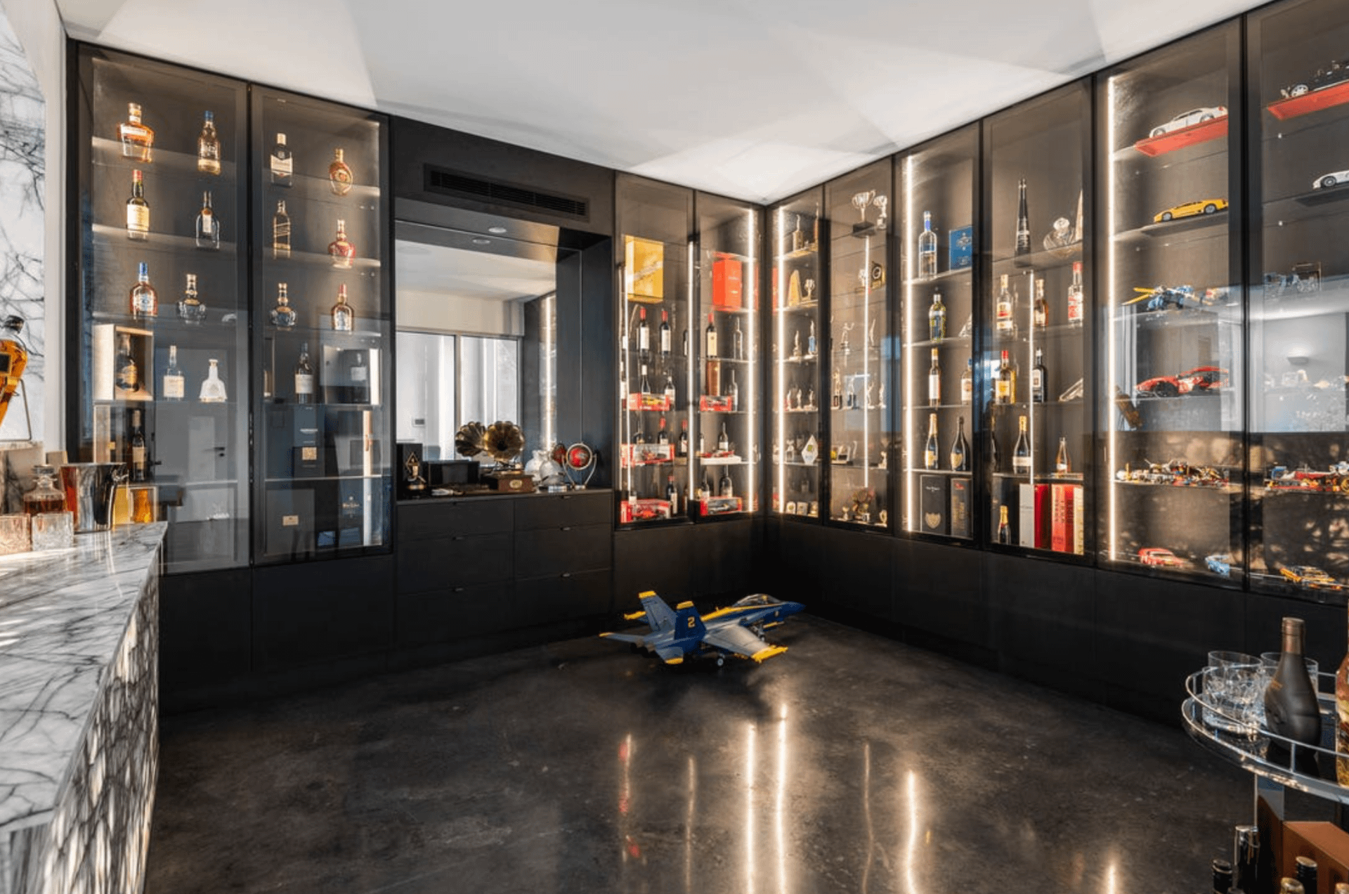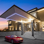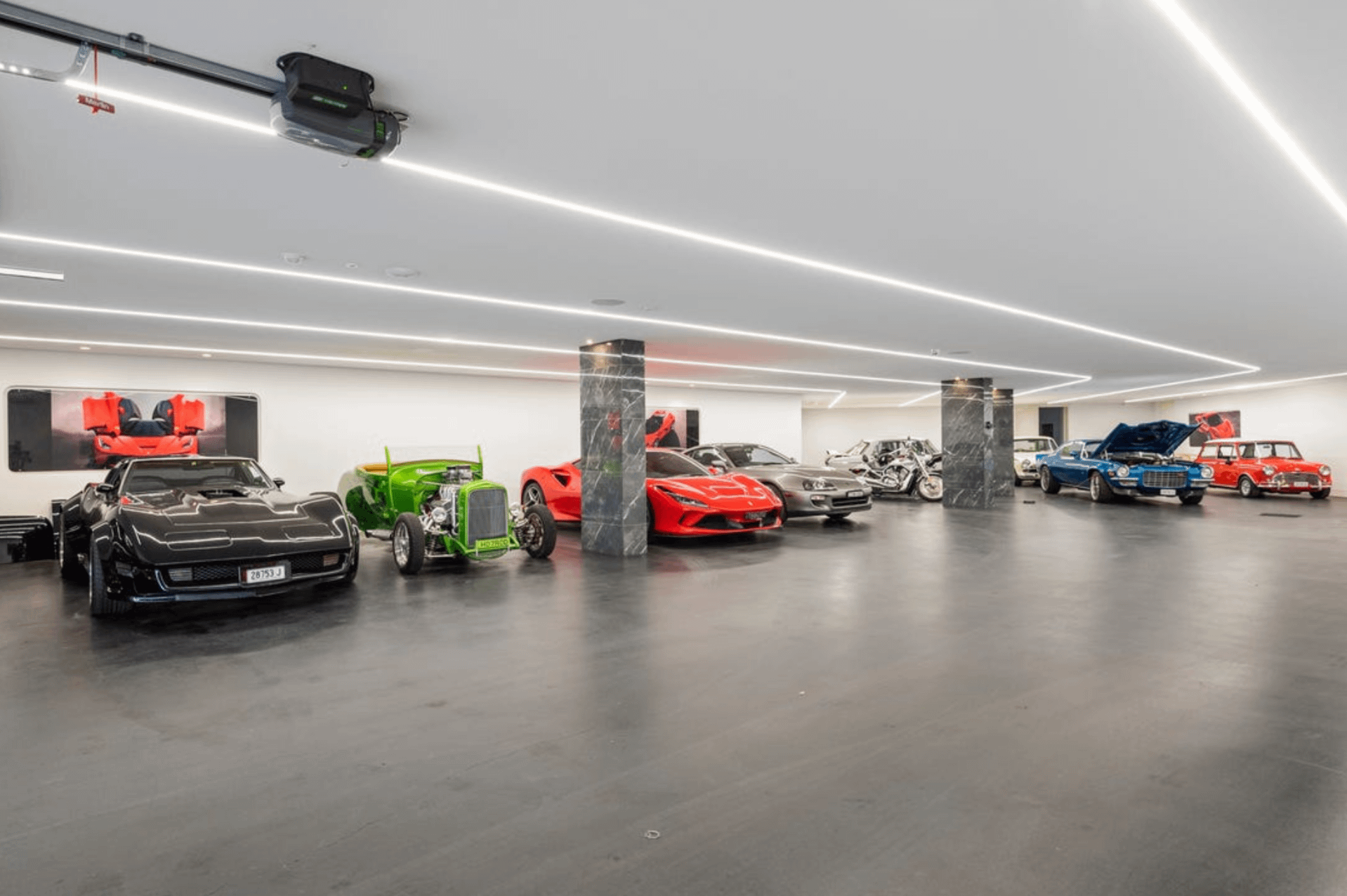 The main house features 5 bedrooms, living & dining rooms, wet bar, movie theater, gym, 20-car garage and more. The guest house features 2 bedrooms.