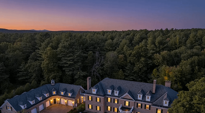 This brick home is located at 6 Lancaster Road in Windham, New Hampshire and is situated on 16 acres of land.